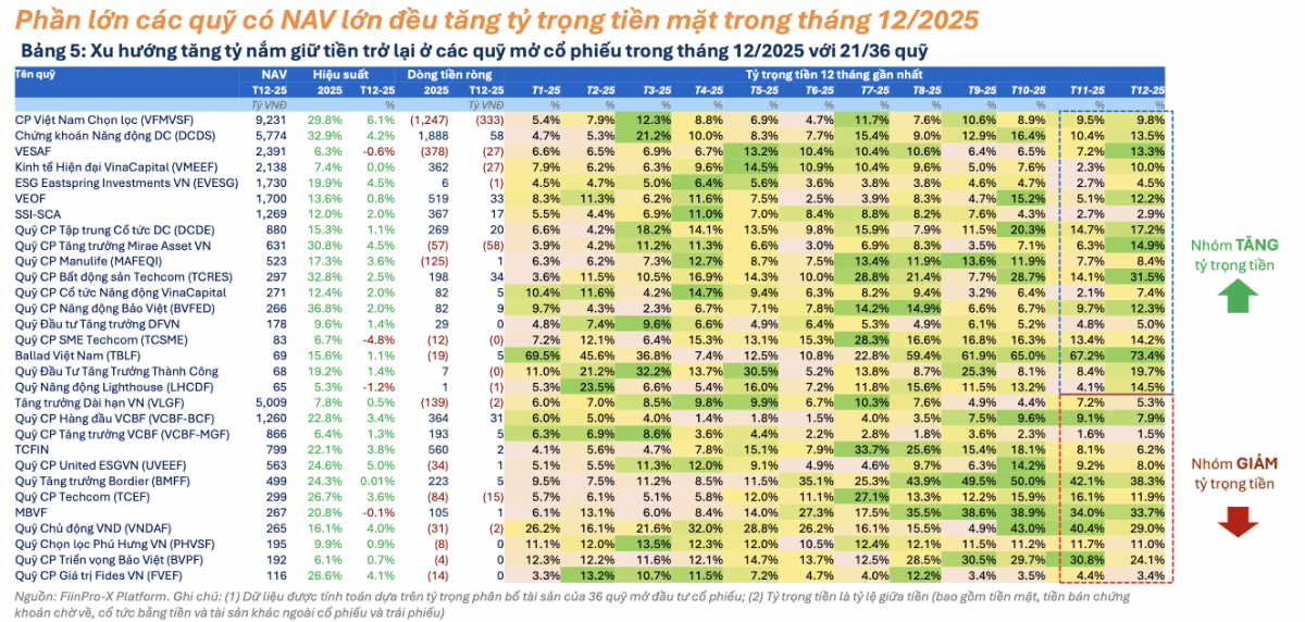 Trong tháng 12/2025, xu hướng tăng tỷ trọng tiền quay trở lại ở nhóm quỹ mở cổ phiếu với 21/36 quỹ tăng nắm giữ tiền so với 13/36 quỹ trong tháng 11/2025, theo số liệu thống kê từ FiinTrade.