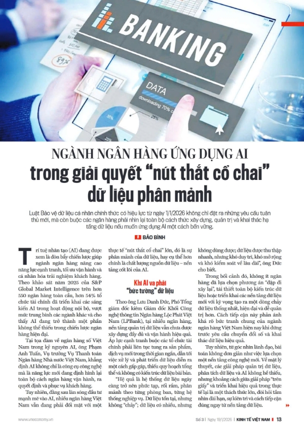 Tuy nhiên, sự phân mảnh dữ liệu đang là một “nút thắt cổ chai” lớn. Theo ông Lưu Danh Đức, Phó Tổng giám đốc kiêm Giám đốc Khối Công nghệ thông tin Ngân hàng Lộc Phát Việt Nam (LPBank), nhiều ngân hàng chưa xây dựng nền tảng quản trị dữ liệu đầy đủ, dẫn đến việc xử lý dữ liệu gấp gáp, thiếu quy hoạch tổng thể và kiến trúc bài bản. Hệ quả là dữ liệu trở nên phức tạp, phân mảnh theo phòng ban và hệ thống nghiệp vụ, không được sử dụng hiệu quả.