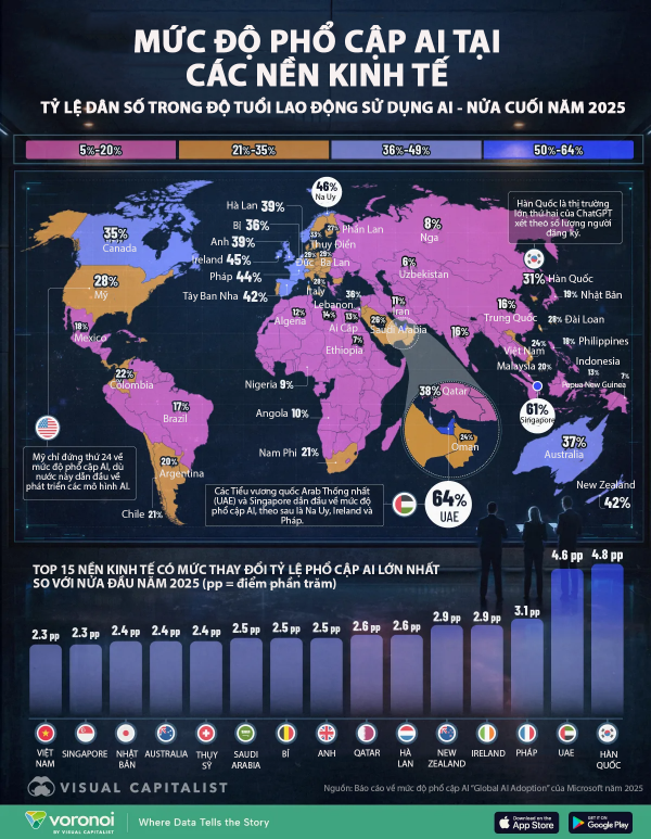 Đồ họa thông tin dưới đây cho thấy mức độ phổ cập AI theo từng nền kinh tế, dựa trên báo cáo phân tích 157 nền kinh tế của hãng công nghệ Microsoft.