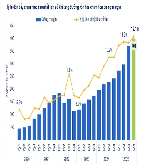 Dư nợ margin toàn thị trường đạt hơn 401 nghìn tỷ đồng tại thời điểm cuối năm 2025, tiếp tục tăng 8% so với quý 3/2025 nhưng ghi nhận xu hướng chậm lại, đặc biệt tại nhóm công ty chứng khoán quy mô lớn, theo số liệu thống kê từ FiinTrade.