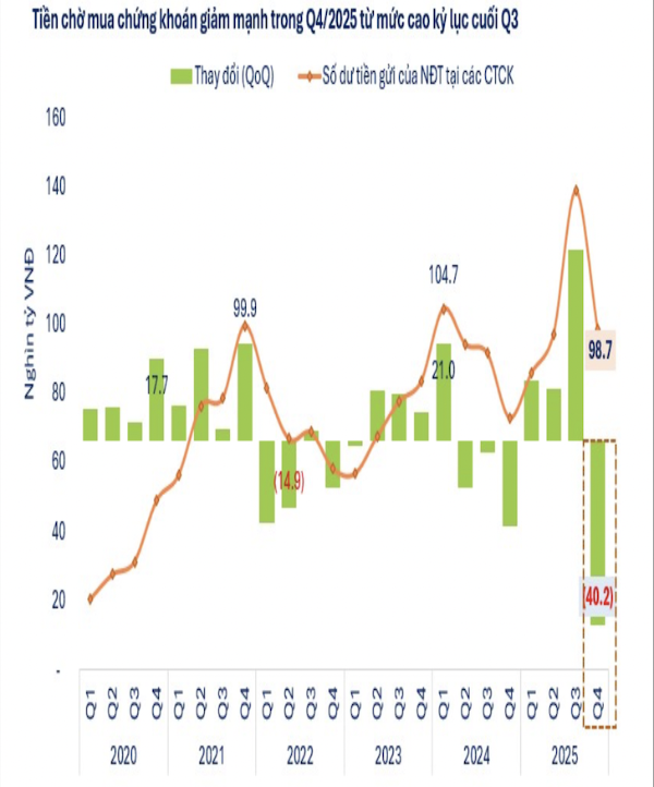 Trong khi đó, tiền chờ mua chứng khoán giảm mạnh trong quý 4/2025. Trong quý 4/2025, lượng tiền chờ mua chứng khoán (tiền gửi của nhà đầu tư tại các công ty chứng khoán) ghi nhận mức sụt giảm mạnh, giảm gần 29% xuống còn khoảng 98,7 nghìn tỷ đồng, sau khi đạt đỉnh trong quý 3/2025.