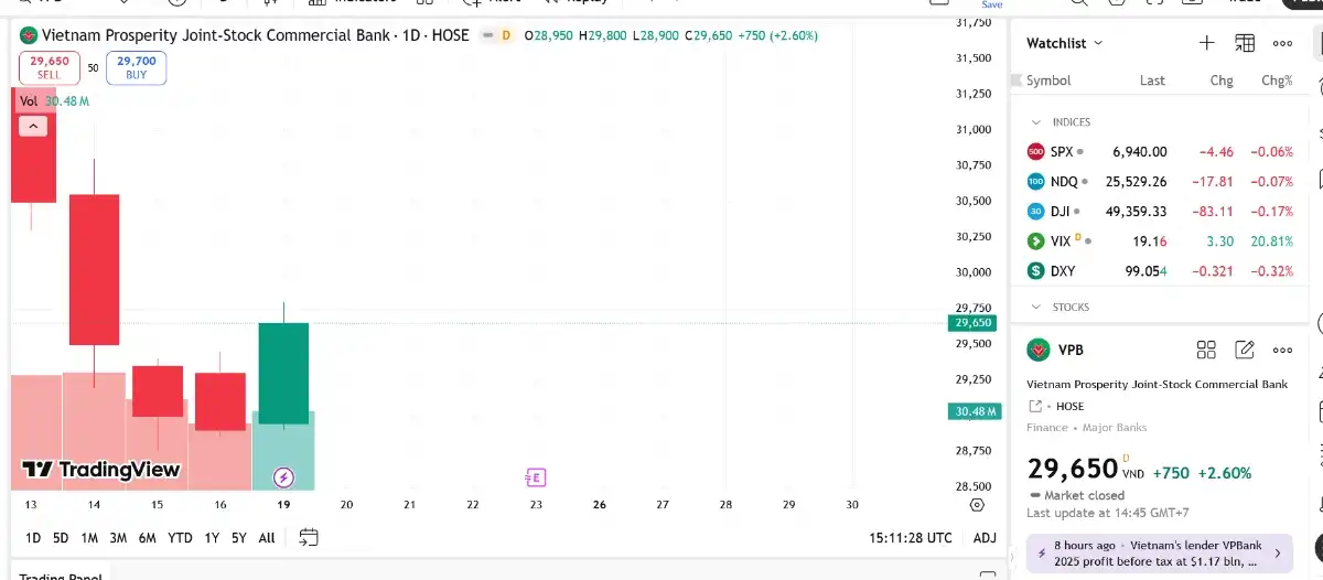 Kết thúc năm 2025, VPB ghi nhận thu nhập lãi thuần đạt 101.259 tỷ đồng (cùng kỳ đạt 81.033 tỷ đồng); lãi trước thuế đạt 30.625 tỷ đồng, tăng 35% so với cùng kỳ (cùng kỳ 20.012 tỷ) và lãi sau thuế đạt 24.354 tỷ đồng (cùng kỳ 15.986 tỷ đồng).