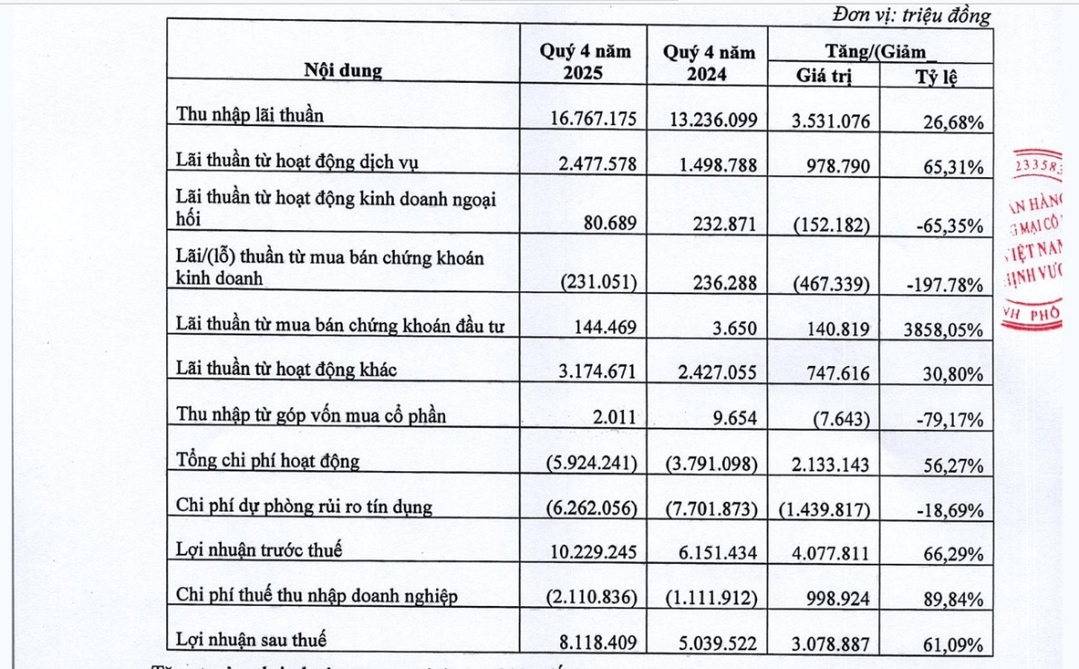 Kết thúc quý 4/2025, thu nhập lãi thuần tăng 26,68% lên 16.767 tỷ đồng; lãi thuần từ hoạt động kinh doanh ngoại hối giảm 65,35% còn 80,68 tỷ đồng; lãi thuần từ mua bán chứng khoán kinh doanh lỗ 197,78% -231,051 tỷ đồng; lãi thuần từ mua bán chứng khoán đầu tư tăng 3.858,05% đạt 144,469 tỷ đồng; lợi nhuận trước thuế tăng 66,29% đạt 10.229 tỷ đồng; lợi nhuận sau thuế tăng 61,09% lên hơn 8.118 tỷ đồng.