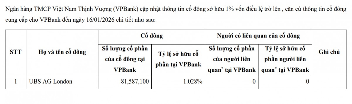 UBS AG London nắm giữ hơn 81,5 triệu cổ phiếu VPB, tương đương 1,028% vốn điều lệ ngân hàng.