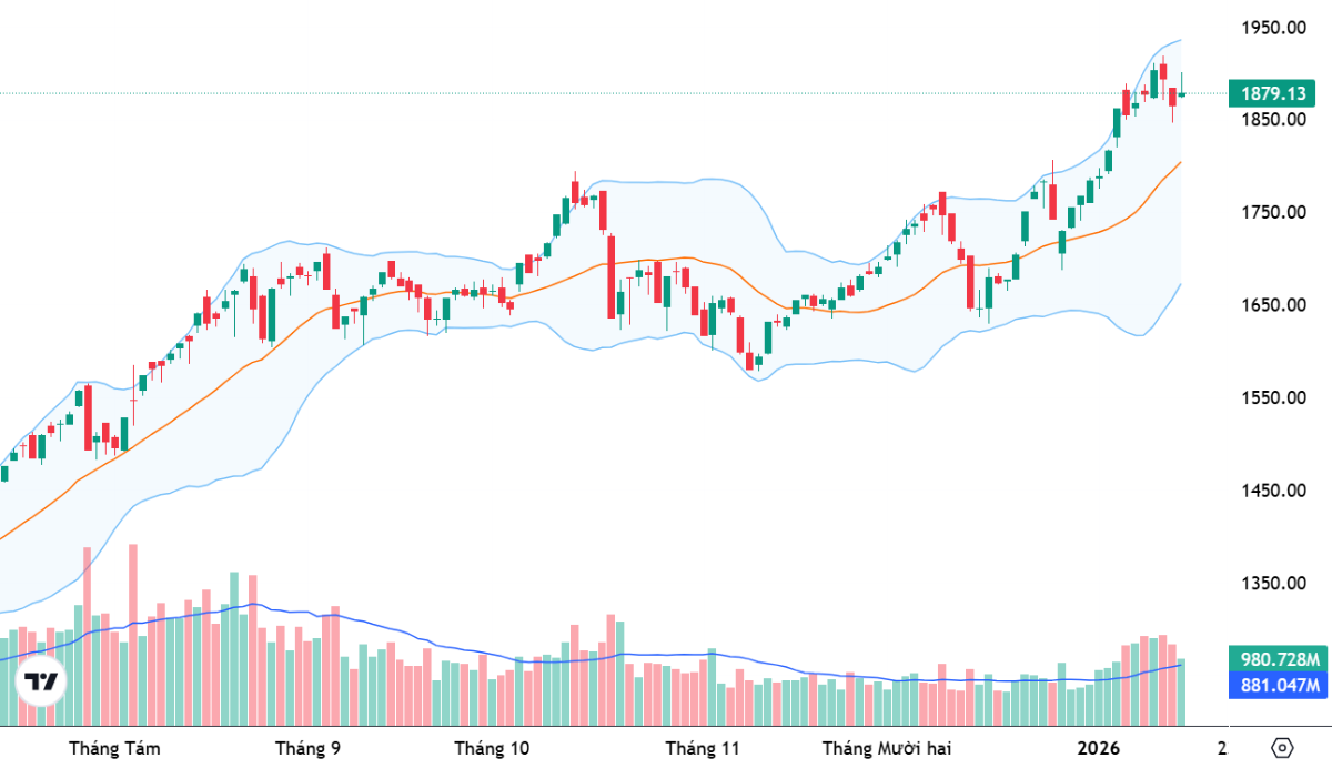 Diễn biến giao dịch tuần vừa qua ghi nhận VN-Index tiếp tục duy trì xu hướng tăng nhẹ với điểm số vẫn giữ trên 1870 điểm, nhưng áp lực giằng co xuất hiện rõ nét khi chỉ số gặp ngưỡng cản quanh vùng 1900 điểm. Điều này là phản ánh tâm lý thận trọng khi chỉ số đã ở vùng giá cao sau đợt bứt phá từ đầu năm. Thanh khoản trên toàn thị trường tăng mạnh với giá trị giao dịch cả tuần vượt 205.000 tỷ đồng, tăng gần 25% so với tuần trước. Điều này cho thấy dòng tiền vẫn rất dồi dào và tham gia rộng khắp, không chỉ tập trung vào một số trụ cột mà lan tỏa sang nhiều nhóm ngành khác nhau. Tôi không nghiêng về kịch bản “phân phối đỉnh” mà coi đây là quá trình hấp thụ cung. Thanh khoản lớn ở đây chứng tỏ lực cầu vẫn rất dồi dào, sẵn sàng hấp thụ hết lượng hàng bán ra.